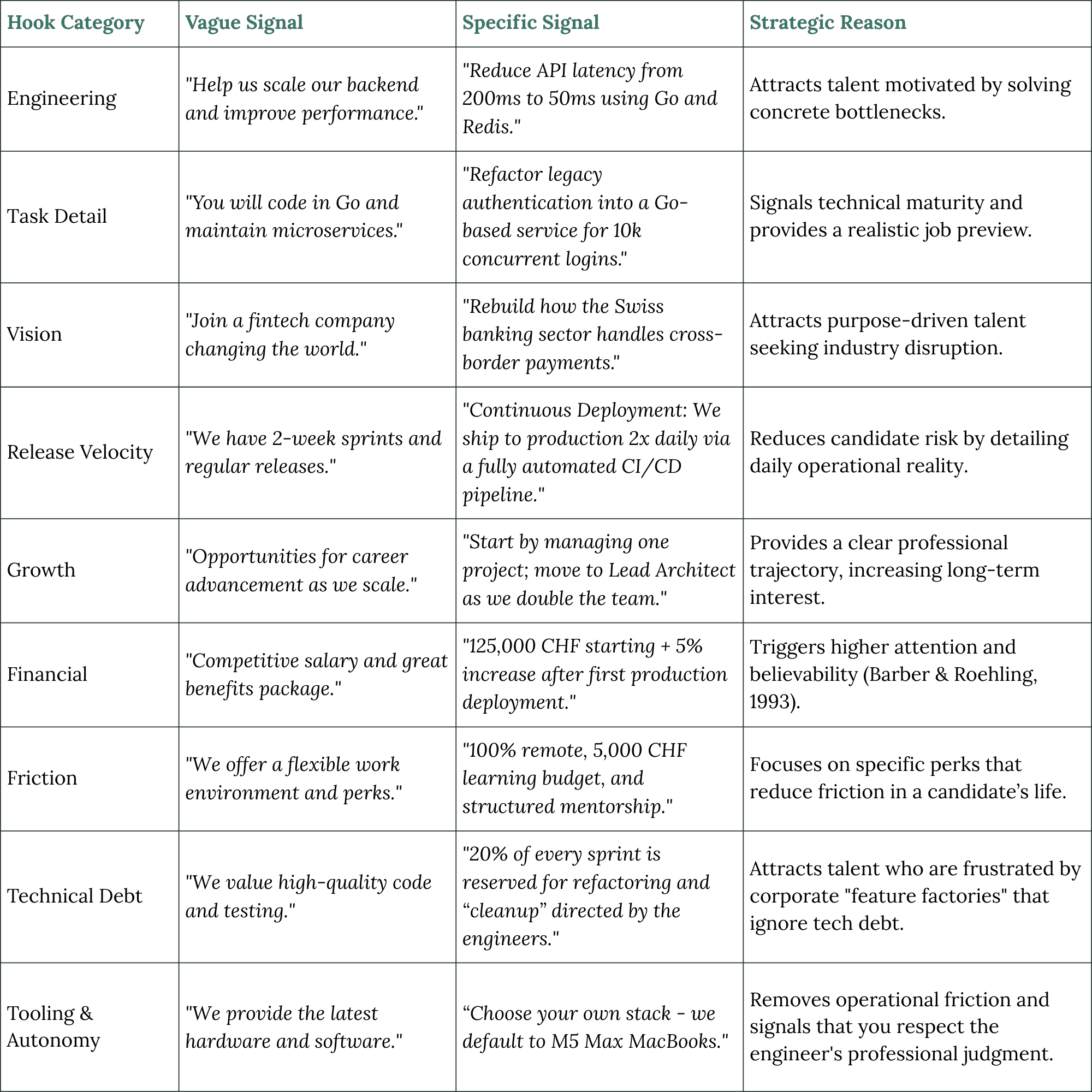 Providing deep technical documentation or engineering blogs. Highly competent candidates seek data to confirm their "hypothesis" that your firm is technically elite (Zuckerman et al., 1995).